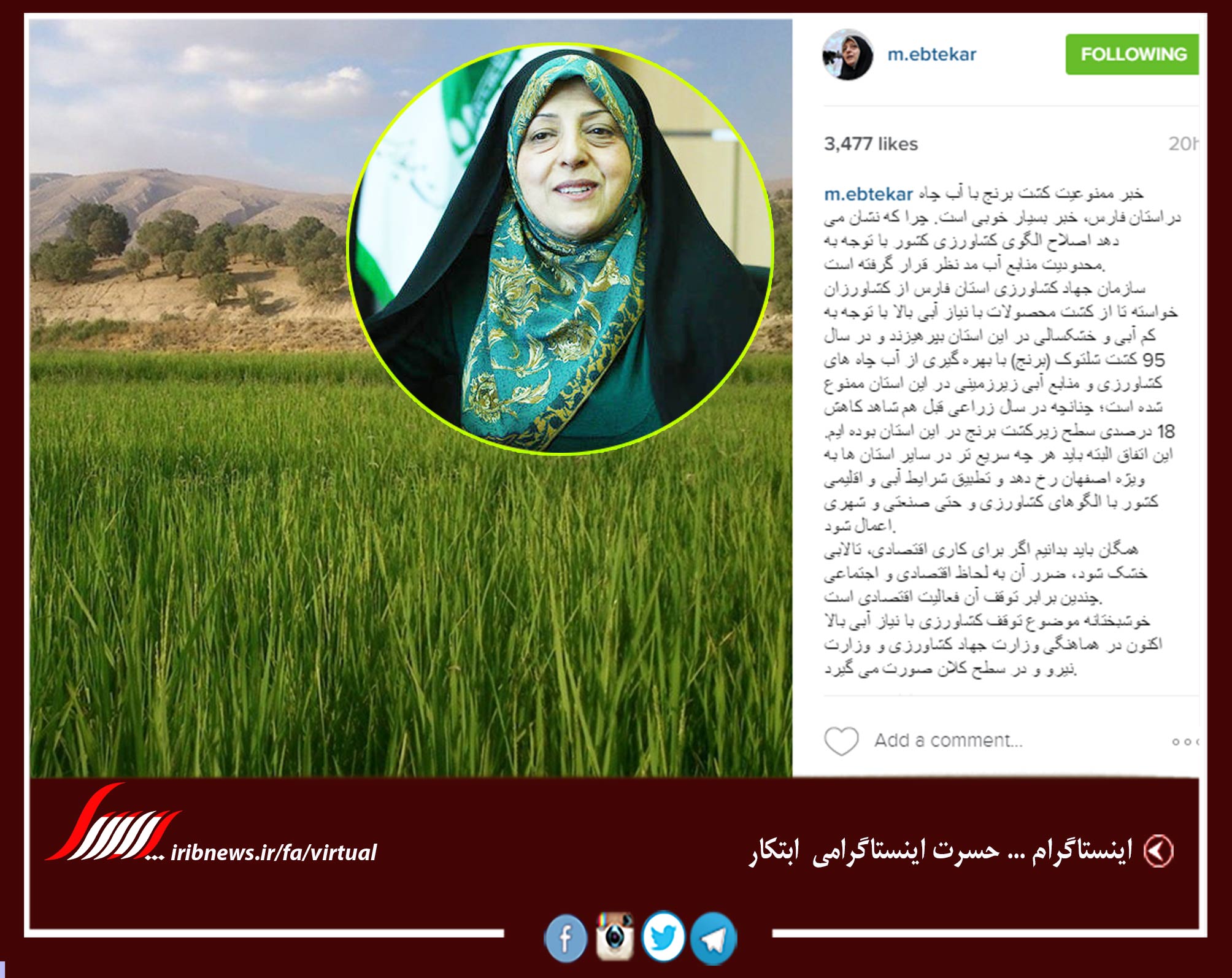 اینستاگرام ... حسرت اینستاگرامی ابتکار این روزها که بسیاری از شالیزارهای برنج با آب چاه تغذیه می شوند، معصومه ابتکار در صفحه اینستاگرام خود با انتشار تصویری از شالیزار خواستار کشت و کار هر استان بنا به شرایط اقلیمی و آب وهوایی خود شد.