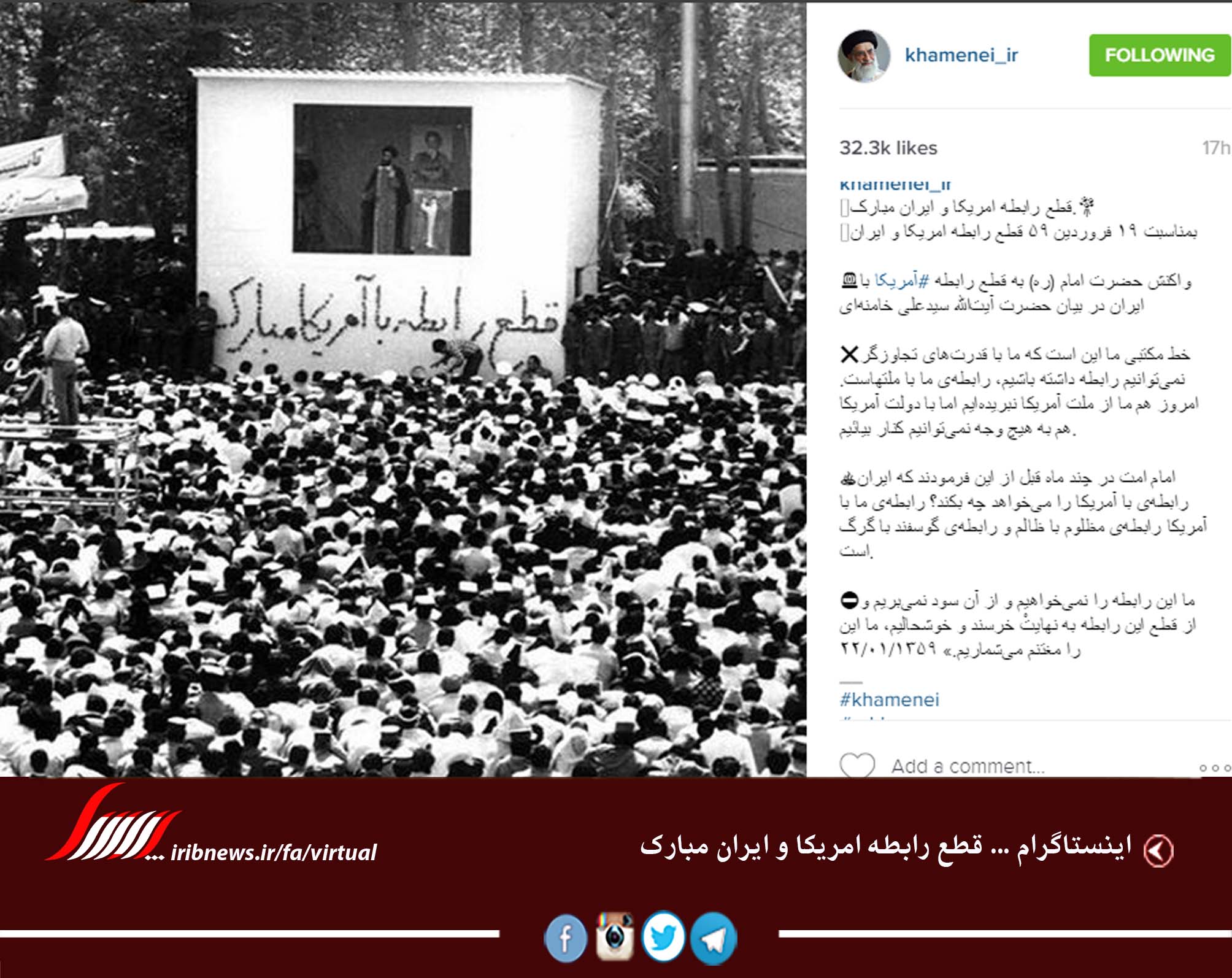 به مناسبت ۱۹ فروردین 13۵۹، سالروز "قطع رابطه امریکا و ایران" در صفحه اینستاگرام منتسب به مقام معظم رهبری، واکنش امام خمینی (ره)نسبت به این قطع رابطه در سال 1359 منتشر شده است. در این پست نوشته شده است: «قطع رابطه امریکا و ایران مبارک.به مناسبت ۱۹ فروردین ۵۹ قطع رابطه امریکا و ایران واکنش حضرت امام (ره) به "قطع رابطه آمریکا با ایران" در بیان حضرت آیتالله سیدعلی خامنهای؛