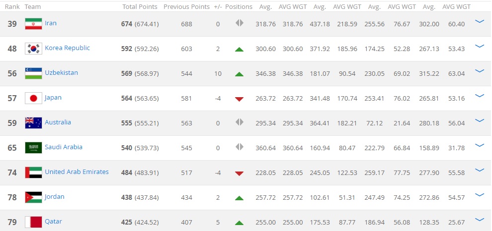 خبرگزاری صداوسیما؛ بر اساس رده بندی جدید فیفا تیم ملی فوتبال ایران همچنان با 674 امتیاز در رتبه 39 جهان و اول آسیا قرار دارد؛ پس از ایران تیم های کره جنوبی، ازبکستان، ژاپن و استرالیا در رده های دوم تا پنجم آسیا قرار دارند.
