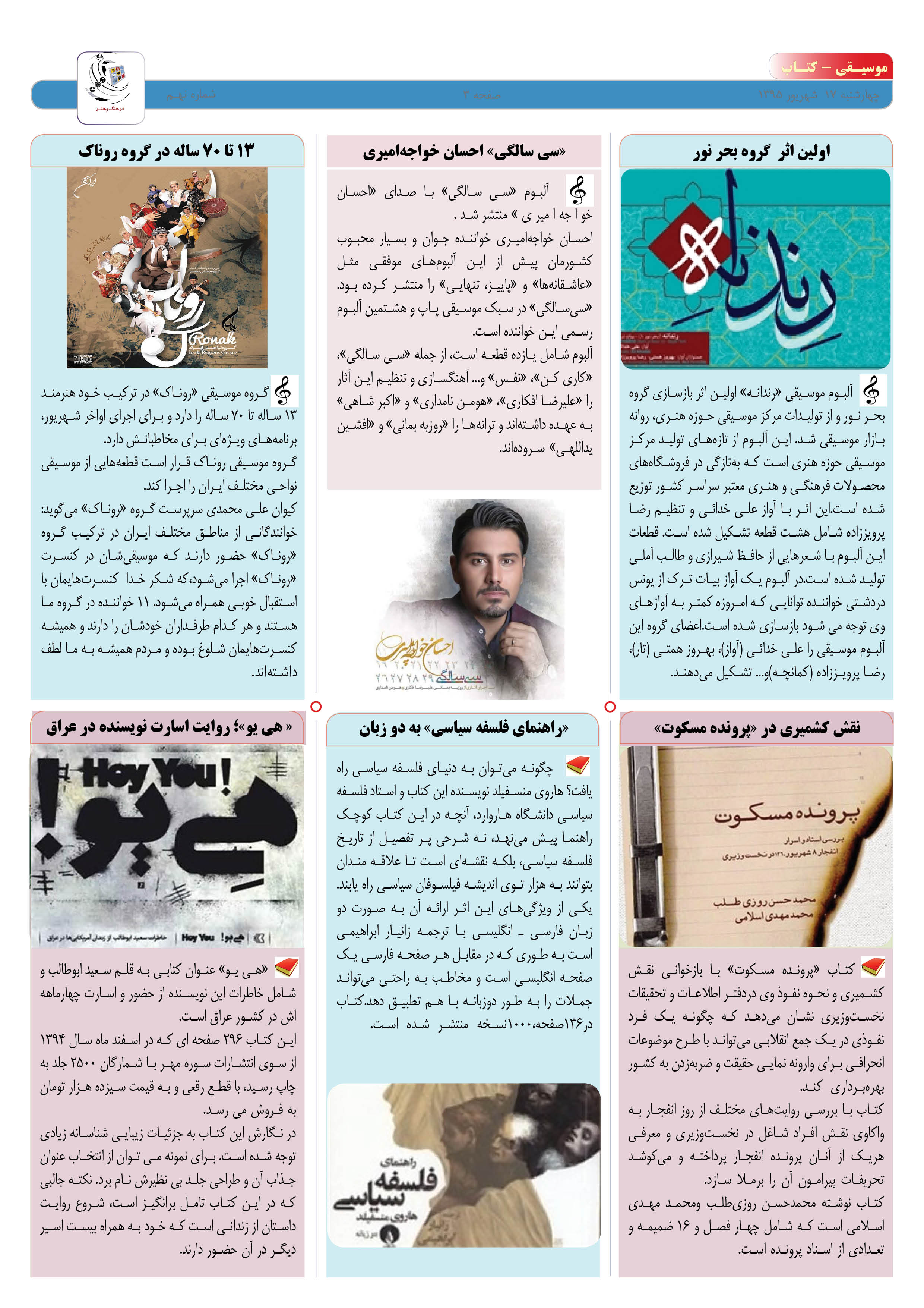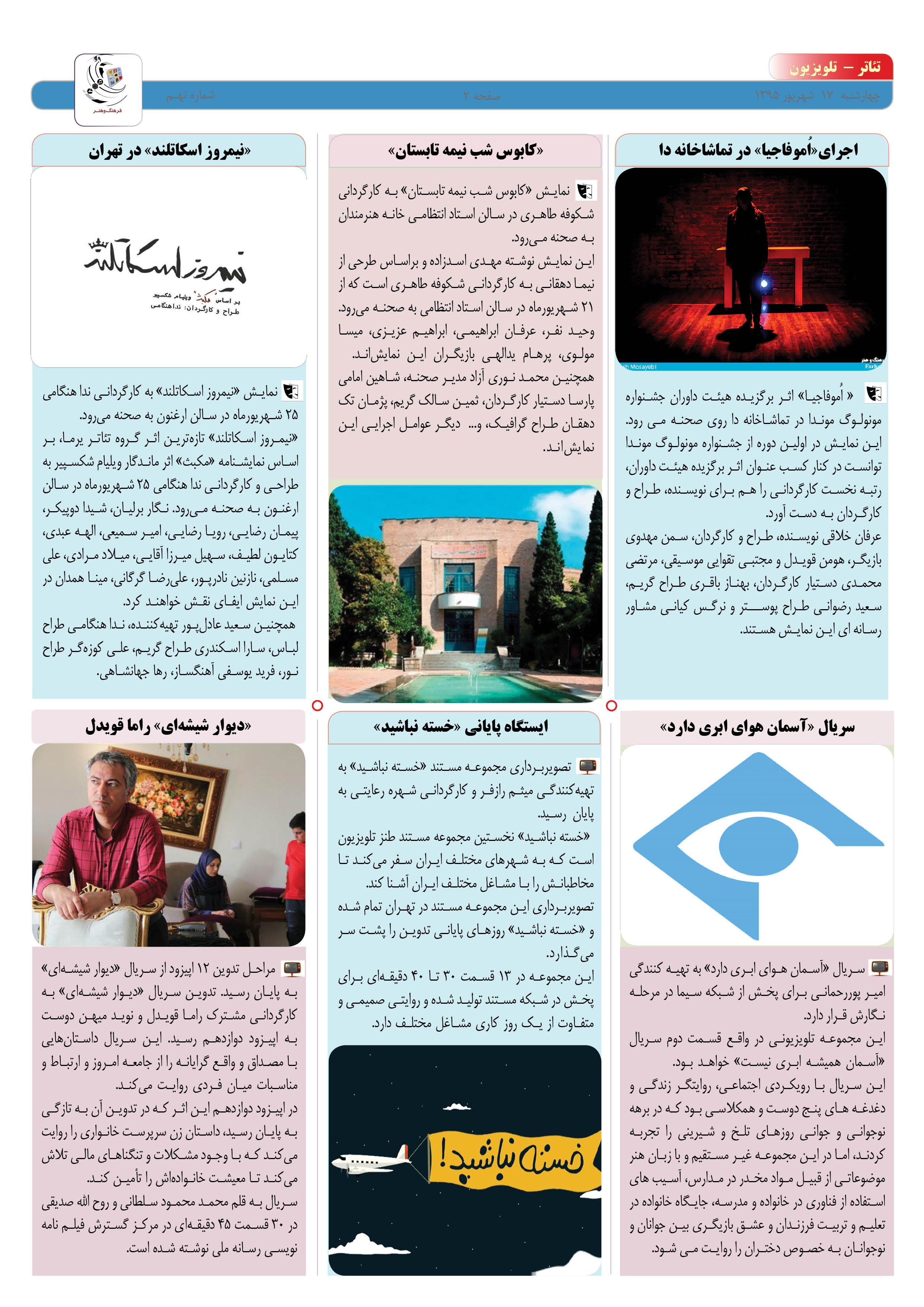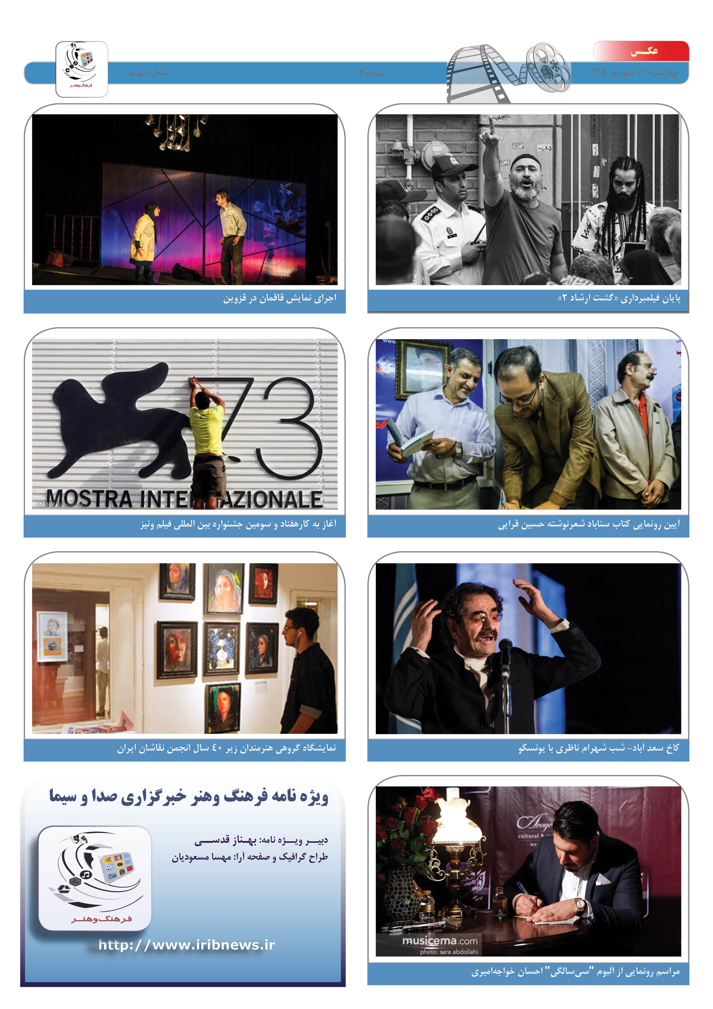 شماره نهم ویژه نامه فرهنگ و هنر با صفحات سینما، تئاتر ـ تلویزیون، موسیقی ـ کتاب و عکس منتشر شد.