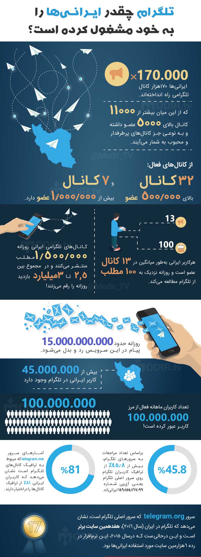 اخیرا معاون محتوایی مرکز ملی فضای مجازی در همایش فضای مجازی در مشهد آماری بیان کرد مبنی بر اینکه 20 میلیون ایرانی در شبکه تلگرام عضویت دارند و روزانه یک میلیارد بازدید از کانال های تلگرامی در ایران انجام می شود که این میزان بازدید از کانال های تلگرام با توجه به جمعیت کشور، قابل تامل است.