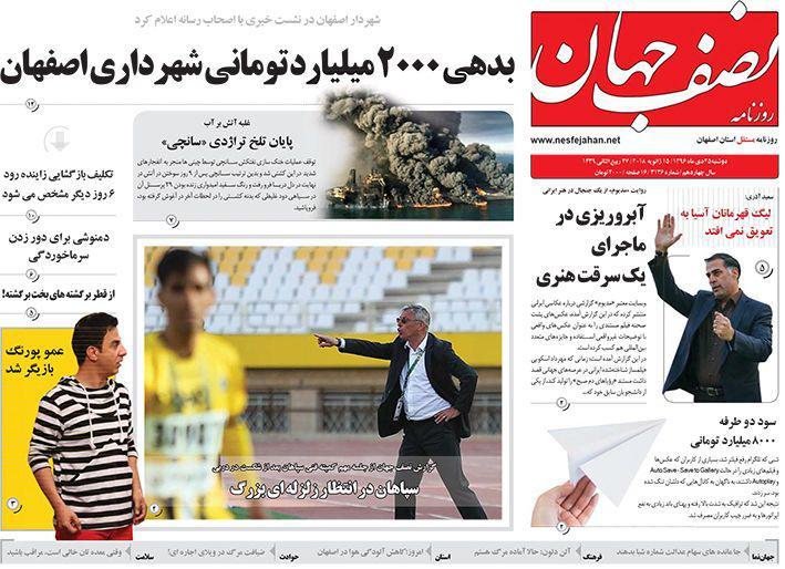 تیترهای دیگر روزنامه های امروز به نشست خبری دیروز شهردار اصفهان اختصاص دارد و از بدهی 2 هزار میلیارد تومانی شهردار ی نوشته اند، ماجرای نامه شهردار به مقام معظم رهبری را با تیتر درشت نامه آبی منتشر کرده اند.