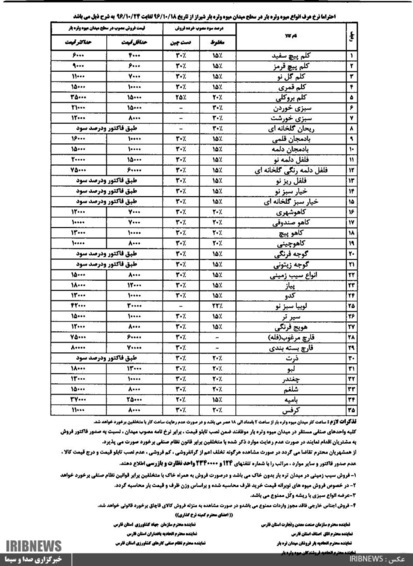 به گزارش خبرگزاری صدا و سیما، مرکز فارس، بر اساس اعلام سازمان اتحادیه میوه و تره بار، نرخ مصوب انواع میوه و تره بار در شیراز تا اطلاع ثانوی به شرح زیر است.