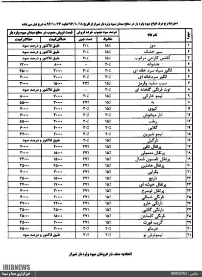 به گزارش خبرگزاری صدا و سیما، مرکز فارس، بر اساس اعلام سازمان اتحادیه میوه و تره بار، نرخ انواع میوه و تره بار در شیراز تا اطلاع ثانوی به شرح زیر است.