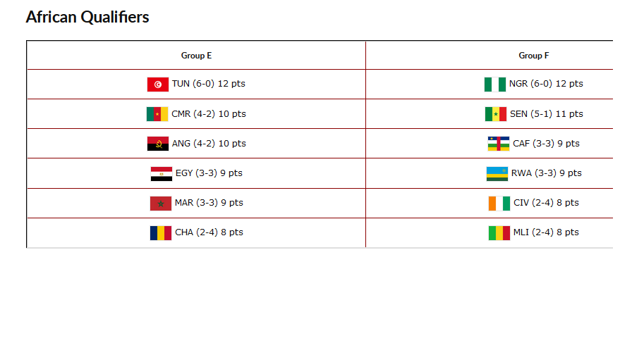 دو تیم برتر از هر گروه E و F به علاوه بهترین تیم سوم یکی از گروه‌ها به جام جهانی صعود می‌کنند و سهمیه این قاره در جام جهانی شامل پنج تیم می‌شود.