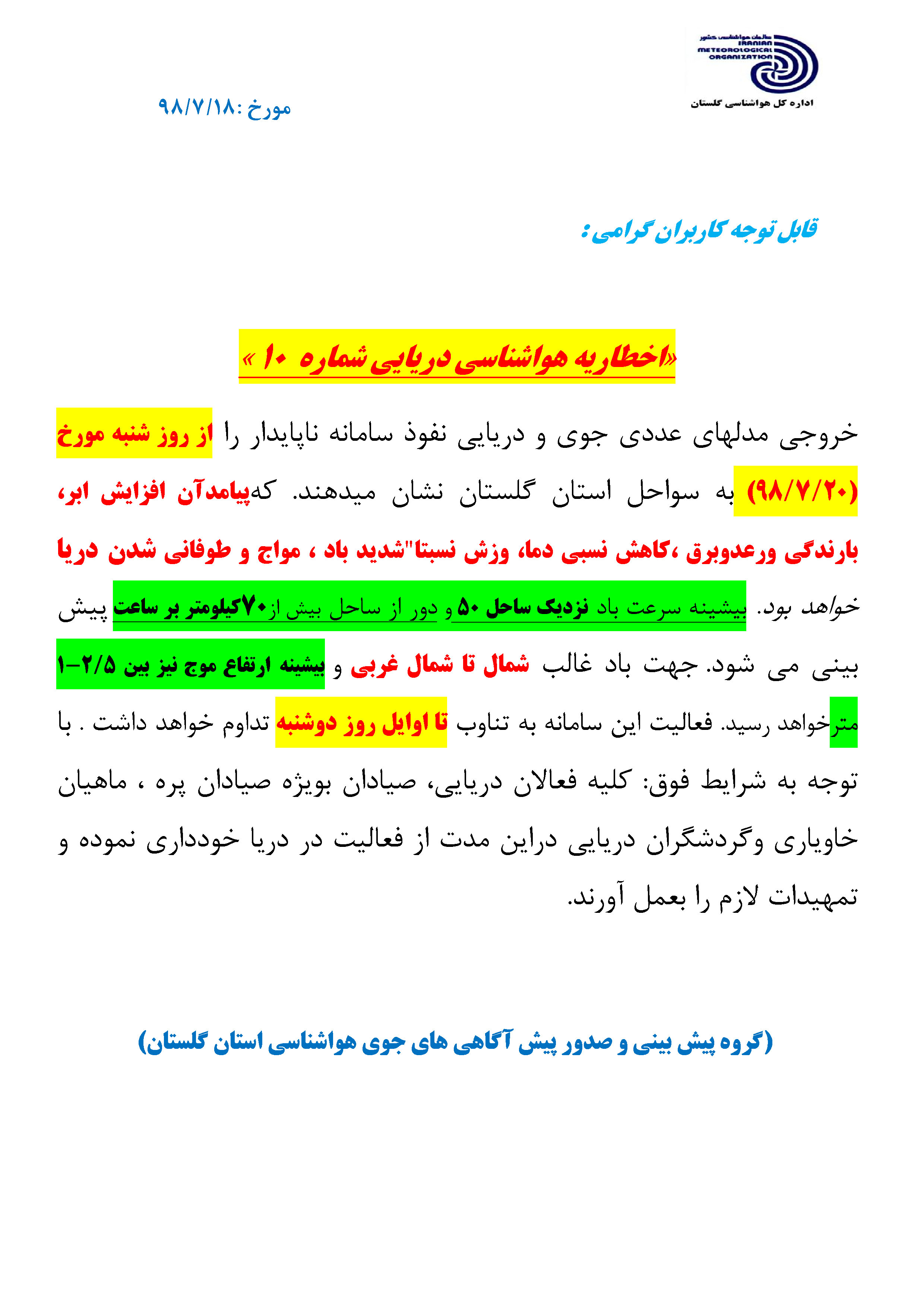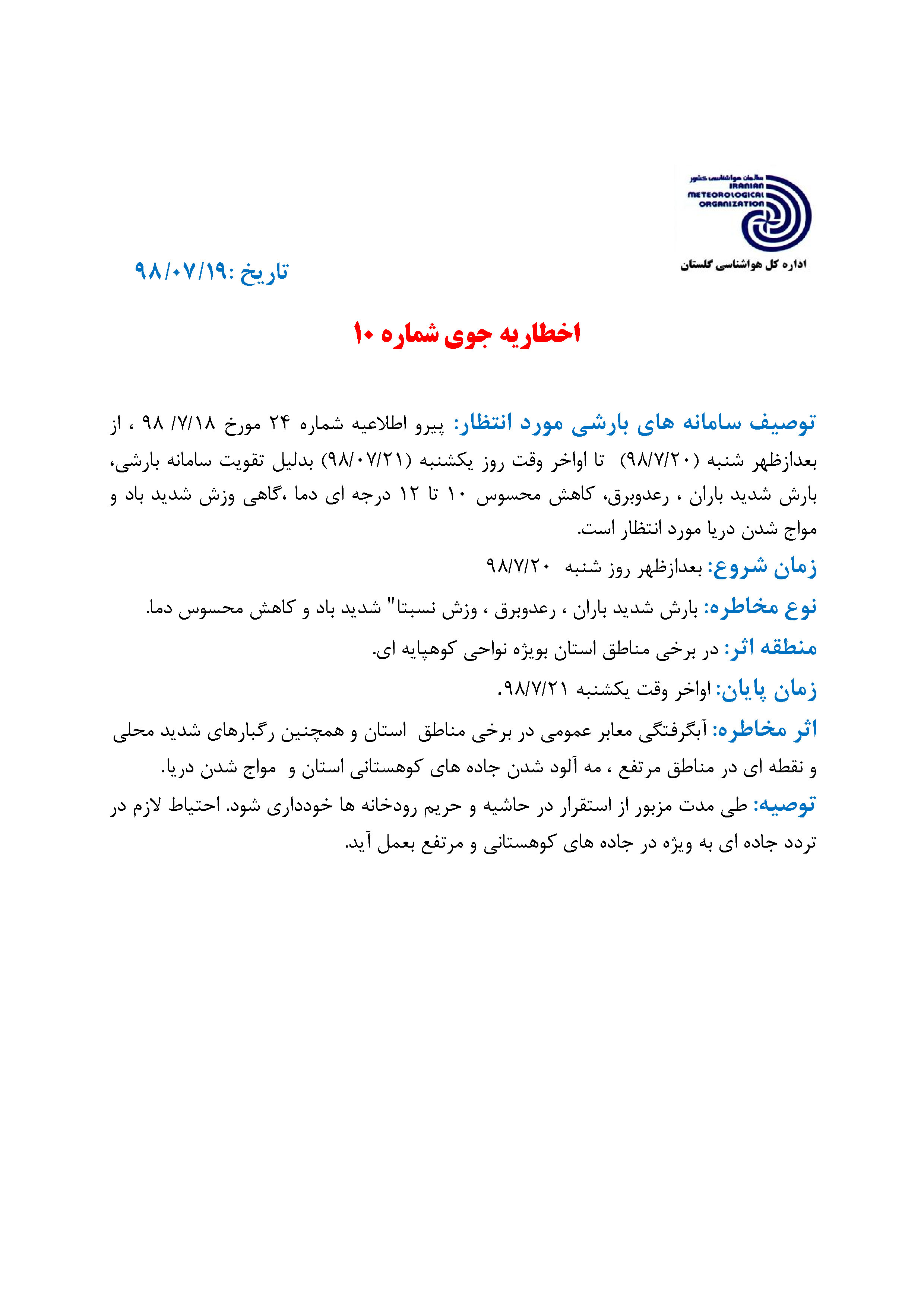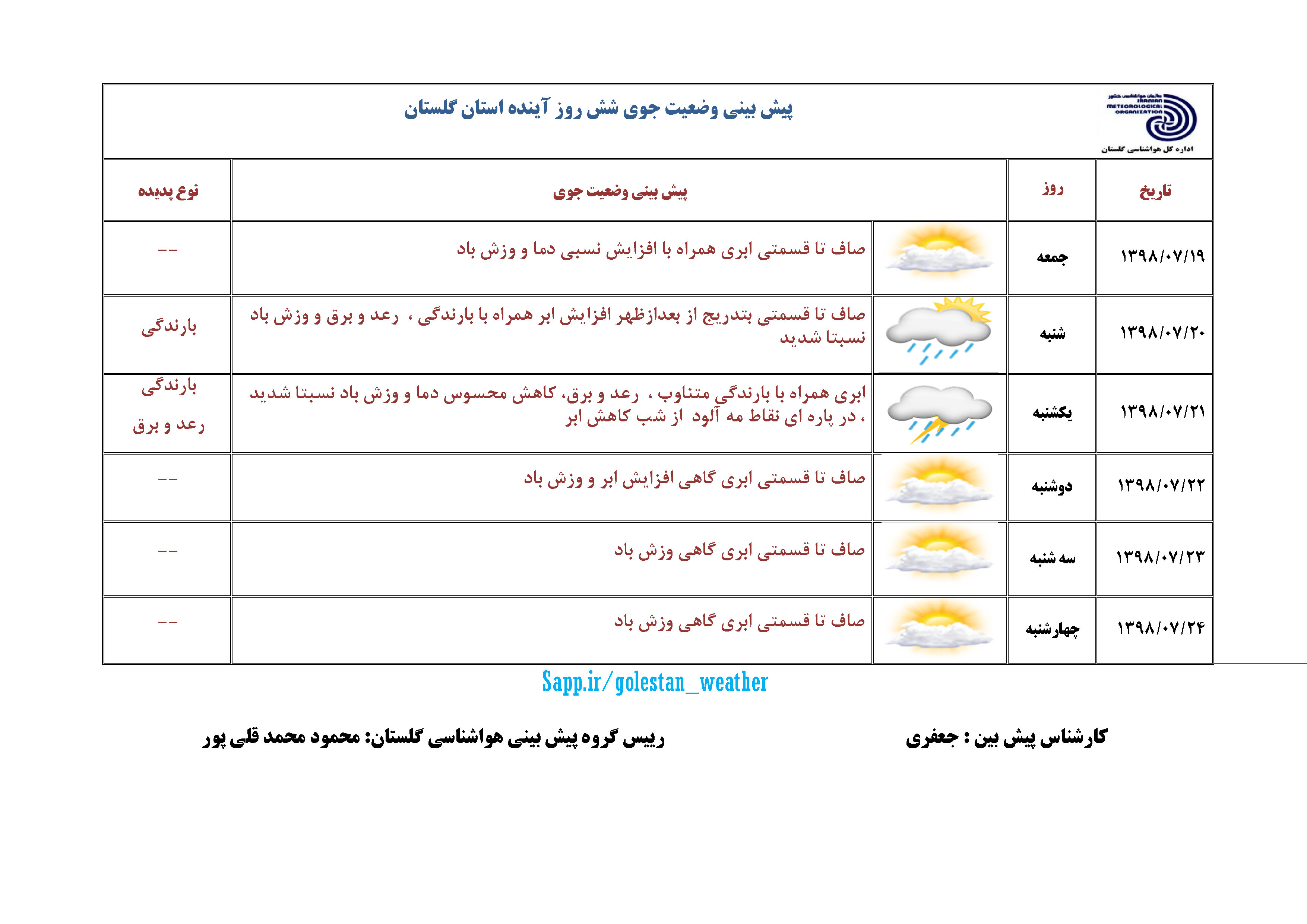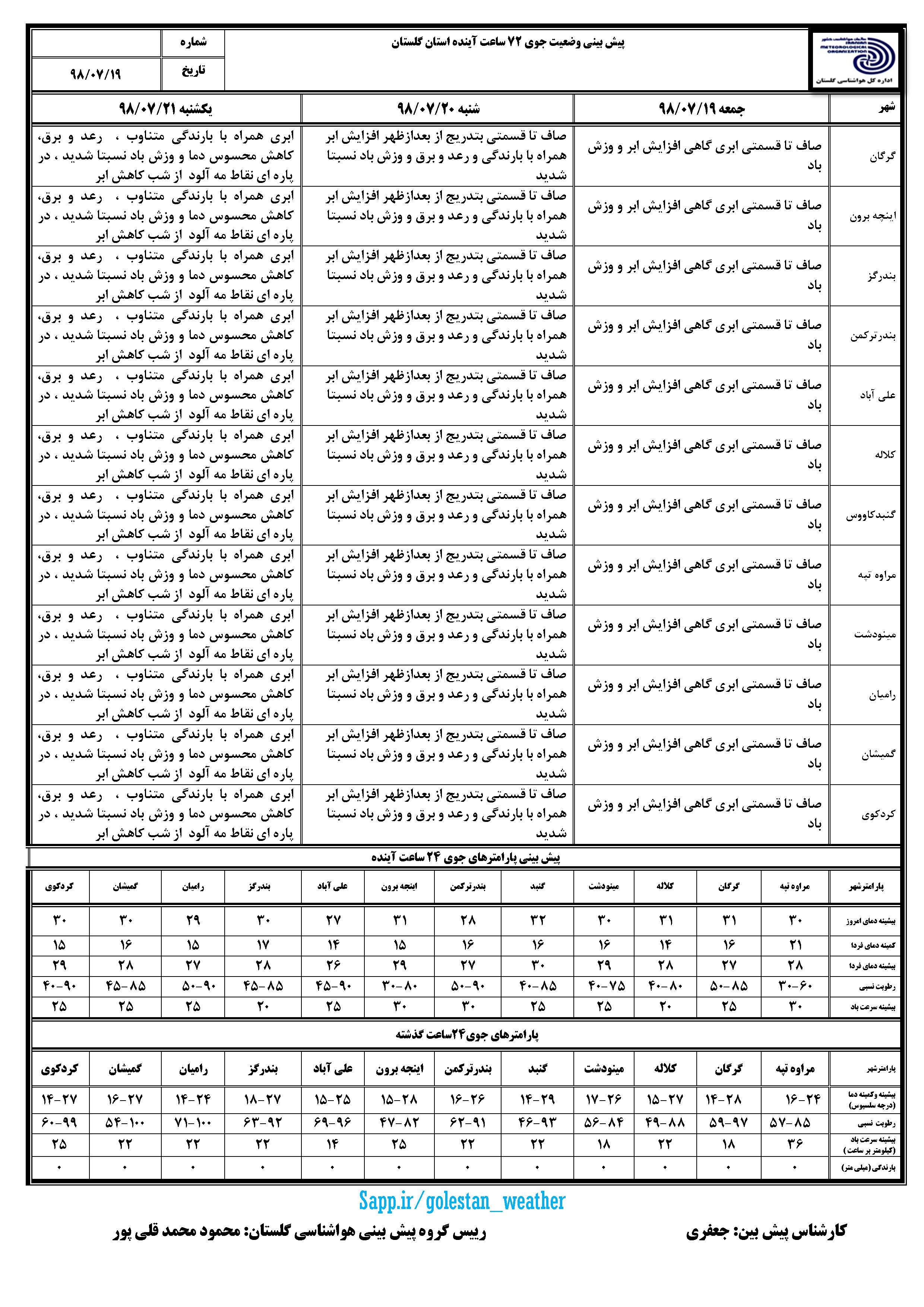 خبرگزاری صداوسیما مرکز گلستان، بر اساس اطلاعیه اداره کل هواشناسی گلستان؛ از بعدازظهر شنبه فعالیت سامانه بارشی در استان آغاز میشود که باراش شدید باران. رعد و برق و گاهی وزش باد شدید به دنبال دارد.