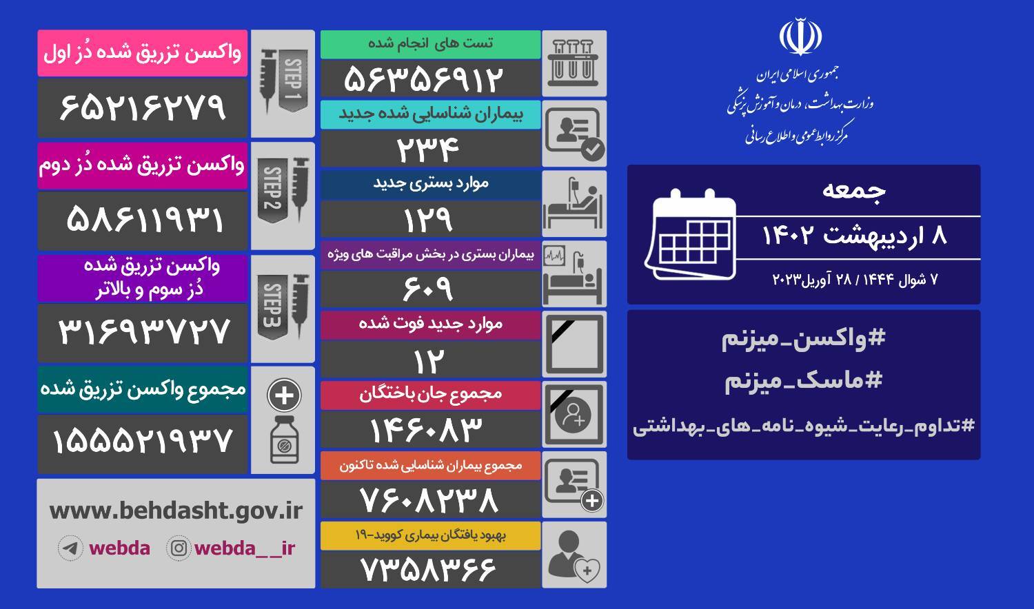 به گزارش خبرنگار خبرگزاری صدا و سیما، از دیروز تا امروز (۸ اردیبهشت ماه ۱۴۰۲) و بر اساس معیارهای قطعی تشخیصی، ۲۳۴ بیمار جدید مبتلا به کووید۱۹ در کشور شناسایی و ۱۲۹ نفر از آنان بستری شدند.