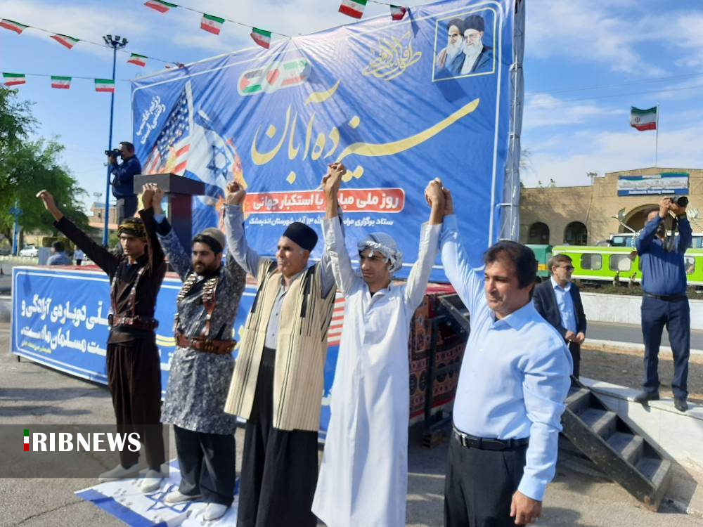 امروز و از ساعت‌های اولیه صبح، مردم شهر‌های مختلف استان خوزستان بار دیگر همبستگی و اتحاد خود را در دفاع از آرمان‌های انقلاب و حفظ ایران اسلامی نشان دادند و با سر دادن شعار مرگ بر اسراییل و مرگ بر آمریکا انزجار خود را از «شیطان بزرگ» فریاد زدند.
