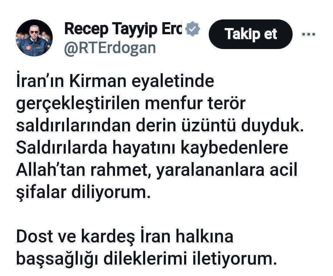 به گزارش سرویس بین الملل خبرگزاری صدا و سیما؛ از آنکارا، رئیس جمهور ترکیه با انتشار پیامی در شبکه اجتماعی ایکس اعلام کرد از دریافت خبر حمله منفور تروریستی در شهر کرمان بسیار متاسف شدیم.