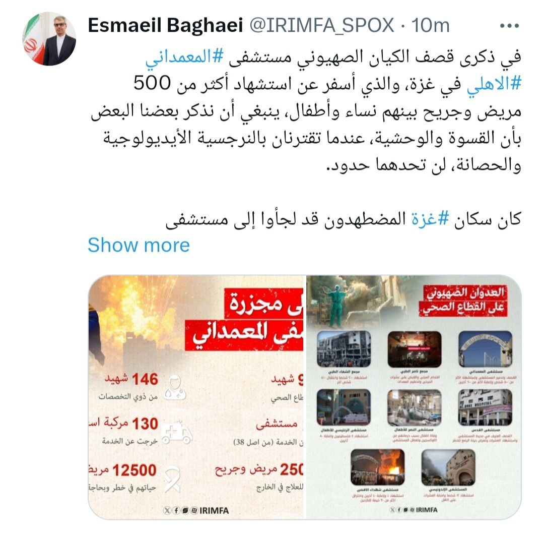 سخنگوی وزارت خارجه کشورمان در سالروز جنایت بیمارستان المعمدانی و شهادت بیش از ۵۰۰ زن و کودک بیمار در این بیمارستان نوشت: حمایت آمریکا و کشورهای اروپایی ضامن جنایات صهیونیستها است.
