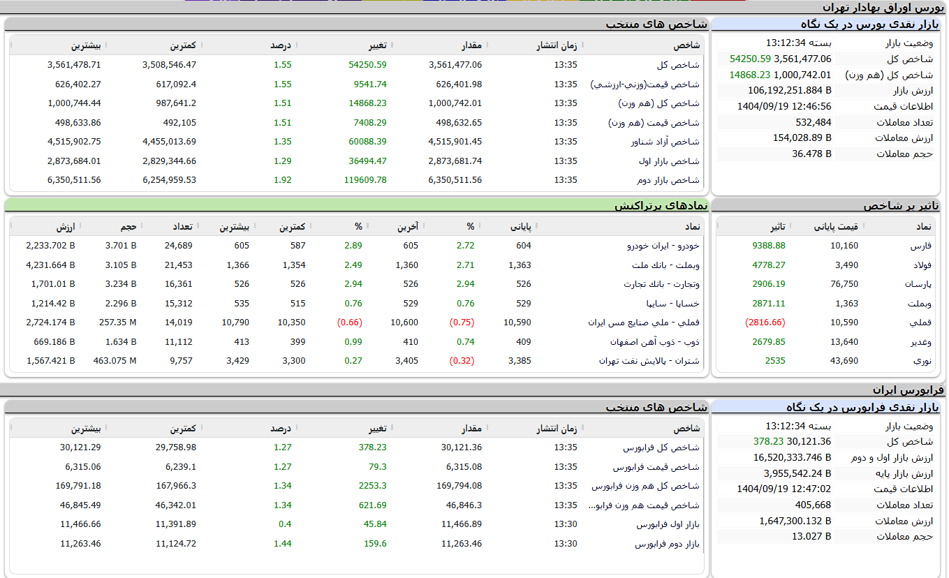 شاخص کل بورس تهران در آخرین روز معاملاتی هفته با افزایش ۵۴ هزار و ۲۵۳ واحد معادل ۱.۵۵ درصد، از مرز سهمیلیون و نیم عبور کرد و در رقم ۳ میلیون و ۵۶۱ هزار و ۴۷۸ واحد ایستاد.